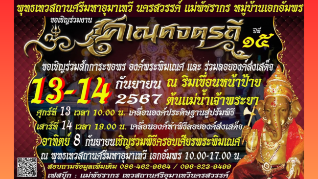 วันศุกร์ที่ 6 กันยายน ถึง วันพฤหัสบดีที่ 12 กันยายน 2567 เปิดให้สักการะขอพร ณ พุทธเทวสถานทั้งวัน เวลา 19.00 น. สวดสาธยายมนต์ ถวายองค์พระพิฆเณศ